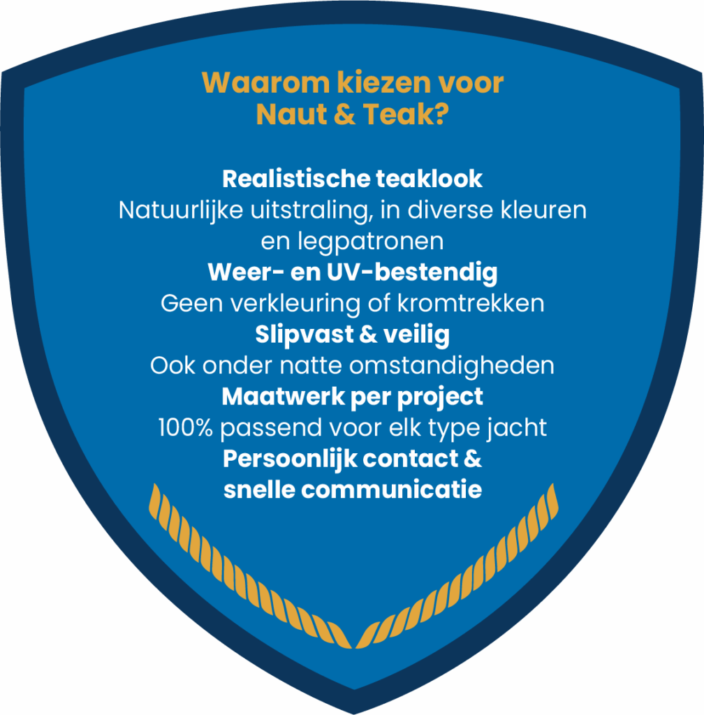 Bij Naut & Teak geloven we dat elk jacht het beste verdient. Daarom leveren wij kunststof teakdekken die de warme uitstraling van echt teak combineren met de voordelen van onderhoudsarm composiet: duurzaam, kleurvast en vrijwel niet van echt te onderscheiden.